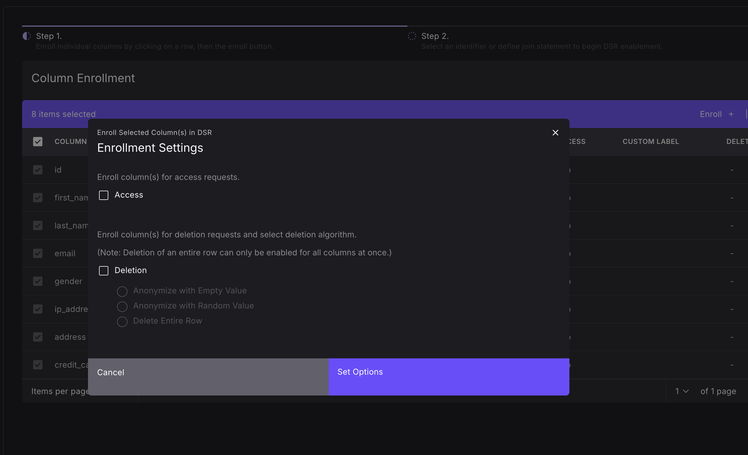 For each table, select a subset or all columns you would like to enroll, and whether you'd like to enroll them for access or deletion requests