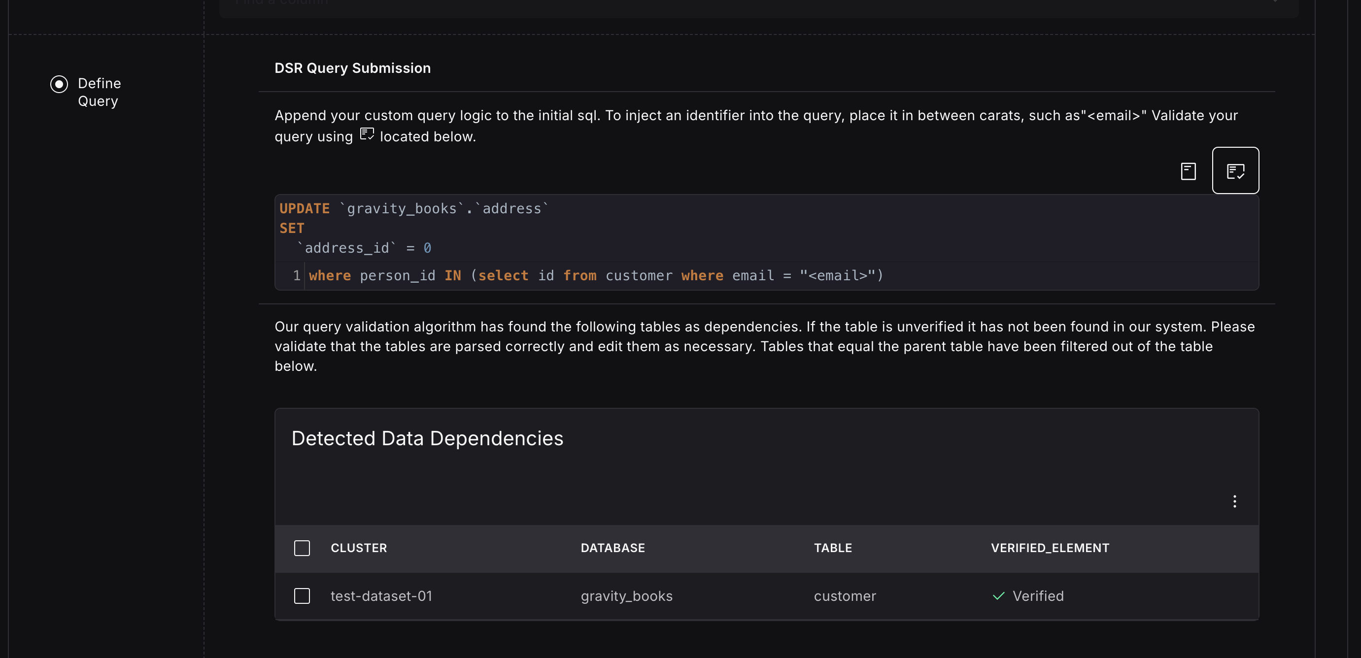 Once your query is defined, validate the query and ensure that Teleskope parsed the correct dependencies. Otherwise, edit the dependency and point it to the right table